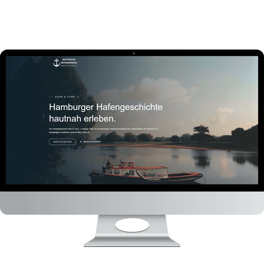 „Die Suhr & Cons. 2 – ein echtes Stück Hamburger Hafengeschichte. 1930 gebaut und liebevoll restauriert, fährt sie heute wieder mit Gästen über die Elbe. Erleben Sie den Charme einer historischen Barkasse im Museumshafen Övelgönne."